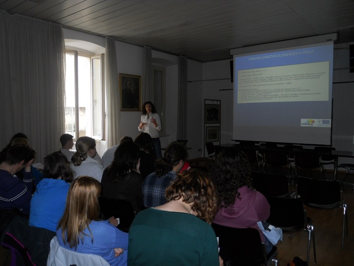 V torek, 22. aprila 2014, se je odvijalo predavanje o zgodovinskih in jezikovnih manjšinah v sklopu obiska študentov 2. in 3. letnika geografije Fakultete za humanistične študije UP iz Kopra, v spremstvu prof. Mihe Kodermana. Predavala je dr. Zaira Vidau, vodja projekta EDUKA. Na slikah med predstavitvijo.