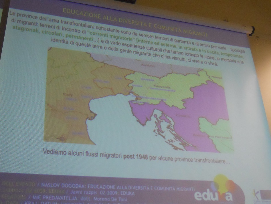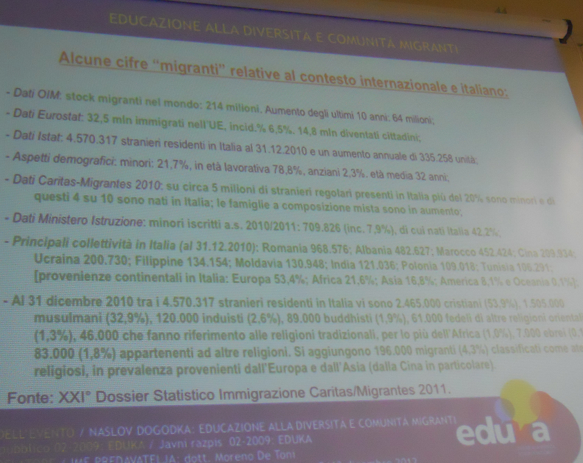 V torek 26. februarja 2013 in v torek 5. marca 2013 sta se odvili dve predavanji o priseljeniških skupinah v prvem in drugem razredu Državnega Tehničnega Zavoda G. Deledda v Trstu. Moreno De Toni je predstavil kulturno posrednico, predstavnico društva Interethnos, Mouno Fares, ki je predstavila potom biografske pripovedi lastno izkušnjo kot migrantka. V aprilu (v torek 16., v sredo 17. in torek 23.) so predvidene še tri delavnice na socio-ekonomskem Liceju Percoto v Vidmu.