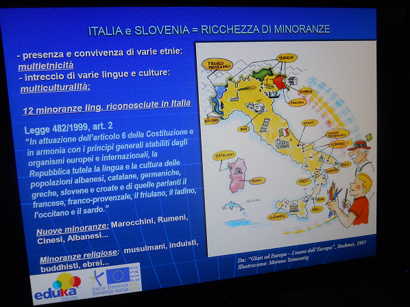 V petek, 22. marca 2013, se je odvijalo predavanje o zgodovinskih in jezikovnih manjšinah v razredu Gimnazije Sema v Piranu. Predavali so: koordinatorka WP4 Marianna Kosic (SLORI), Roberto Bonifacio (Italijanska Unija) in Feliciano Medeot (Società Filologica Friulana). Na slikah: predavatelji in nekateri od sodelujočih na delavnici, sliki power-point predstavitve.
