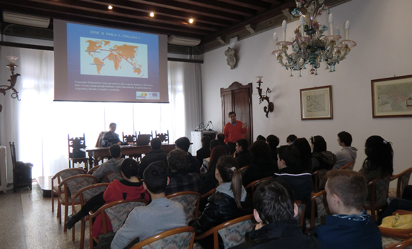 V četrtek, 11. aprila 2013, se je odvijalo predavanje o zgodovinskih in jezikovnih manjšinah na sedežu Società Filologica Friulana v Vidmu. Dijakom 1.HR, 2.HR in 2.IR šole Bolando Stringher iz Vidma so predavali: koordinatorka WP4 Marianna Kosic (SLORI), Roberto Bonifacio (Italijanska Unija) in Feliciano Medeot (Società Filologica Friulana). Na slikah med predavanji in predavatelji.